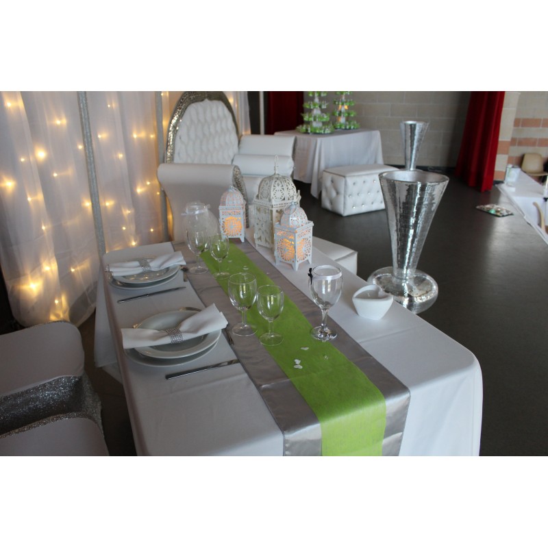Les chemins de tables sont disponibles en plusieurs coloris : argent, bleu, vert, rose, rouge, noir, blanc