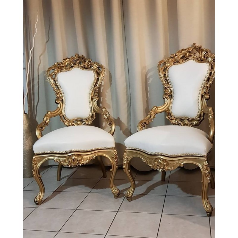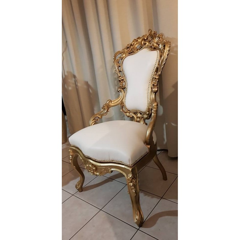 CHAISE BAROQUE EN BOIS D'ACAJOU RECOUVERT DE FEUILLE D'OR ET TAPISSÉ DE SIMILI CUIR BLANC