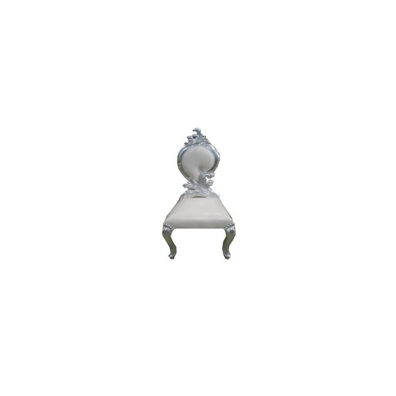 CHAISE BAROQUE EN BOIS D'ACAJOU RECOUVERT DE FEUILLE D'ARGENT ET TAPISSÉ DE SIMILI CUIR BLANC