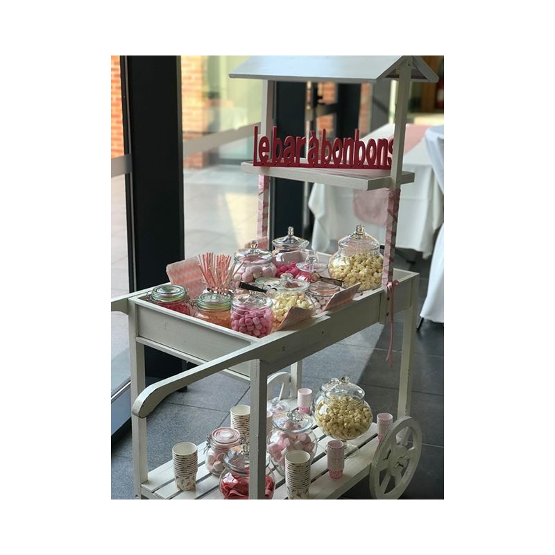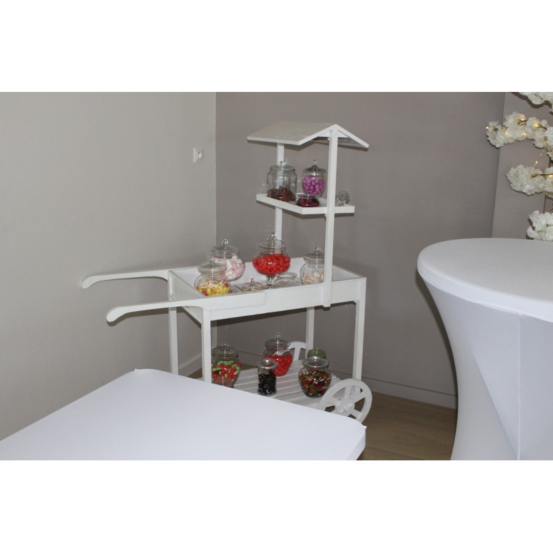 Chariot en bois blanc fourni avec 10 bonbonnières vides de différentes tailles