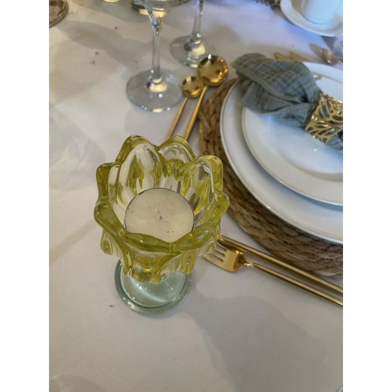 Bougeoir en verre en forme de fleur, au design délicat et coloré. Son pied vert associé à une tête jaune apporte une touche lumineuse et originale à votre décoration de table. Idéal pour créer une ambiance chaleureuse et élégante lors de mariages, réceptions ou événements festifs.