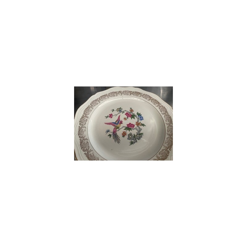 Plat rond « Suzanne » (Réf. 137) aux motifs fleurs et oiseaux avec liseré doré, élégant et vintage, idéal pour sublimer vos tables lors d’événements champêtres ou raffinés.