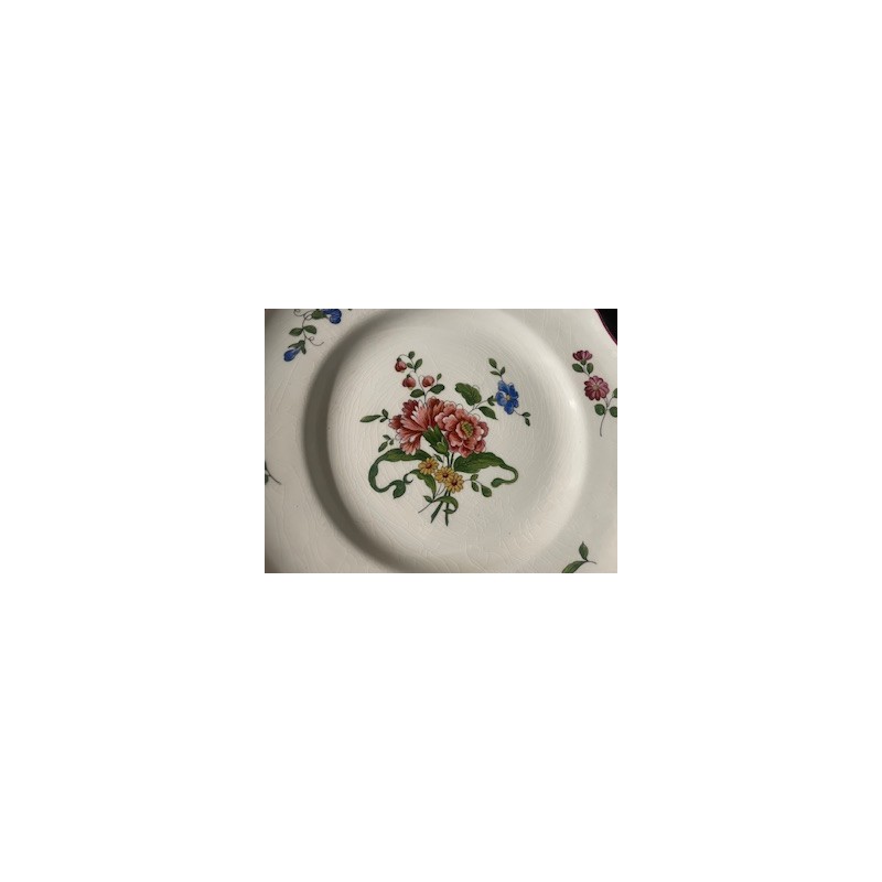 Plat rond « Thérèse » blanc avec fleurs et contour rose, élégant et vintage, idéal pour sublimer vos tables lors d’événements champêtres ou raffinés.