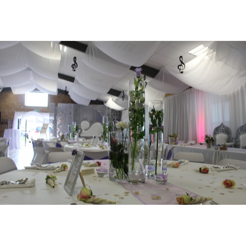 Vase cylindrique transparent d’une hauteur de 60 cm et diamètre de 10 cm.
